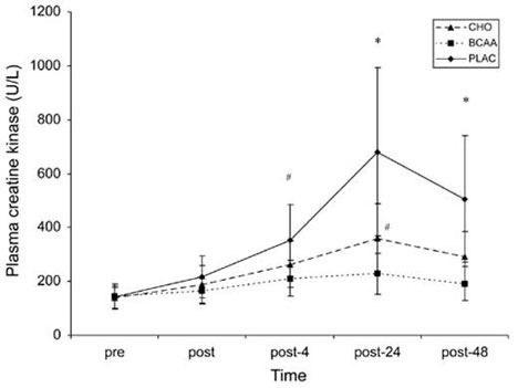 Table 1 demonstrates a greater reduction in creatine kinase (a marker of muscle damage) and muscle soreness with BCAA supplementation compared to a carbohydrate solution and placebo.